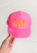 Whether you're going cross country or across the sea, this is the hat you need! This bright pink trucker with yellow embroidery screams summertime!