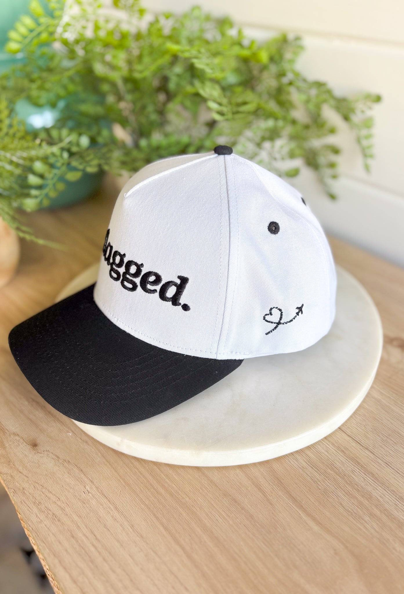 For the traveler who’s always one flight away from a nap, this black and white trucker hat is basically a mood. Embroidered with "Jetlagged" in sleek black stitching (because, let’s be real, the struggle is real), this cap also features a tiny heart and airplane detail on the side—because even when exhausted, you’re still cute. This hat is the perfect accessory for layovers, road trips, or just pretending you’re somewhere fabulous.