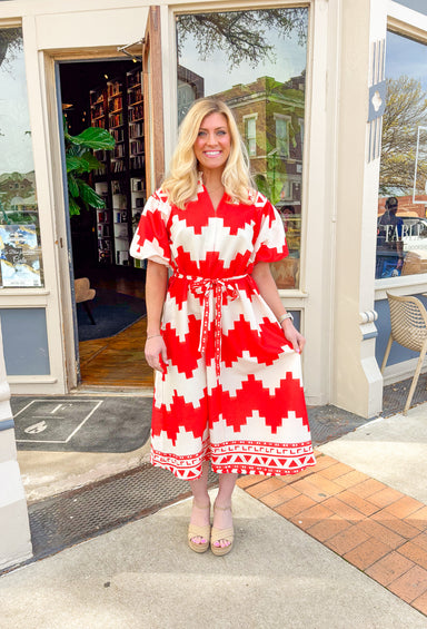 FINAL SALE Add a bold touch to your fall wardrobe with this geometric print midi dress by Entro. Featuring a button-front design and short sleeves,...