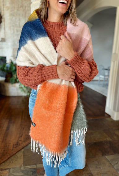 This cozy knit cardigan by Mystree brings warmth and color to your fall wardrobe. Designed in shades of pink, purple, light blue, and cream, it’s f...
