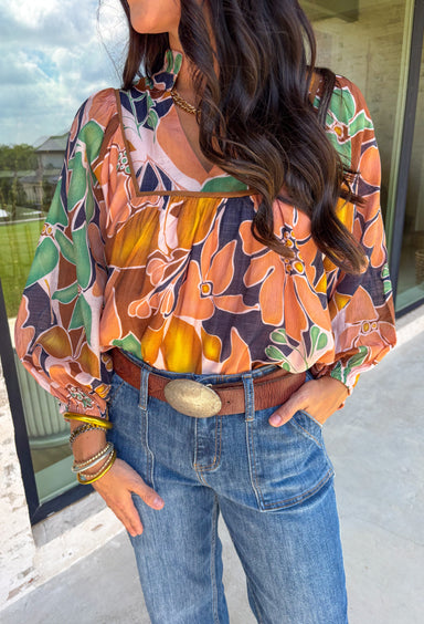 Turn up the color with this cheerful coral top covered in a bold, colorful floral print! The puff sleeves add a fun, flirty shape while the 100% co...