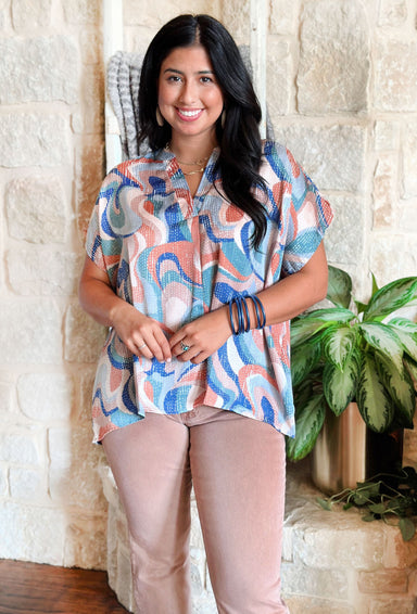 Bring color and texture to your fall wardrobe with this brick long sleeve top by Entro. The vibrant embroidered print in royal blue, white, pink, a...