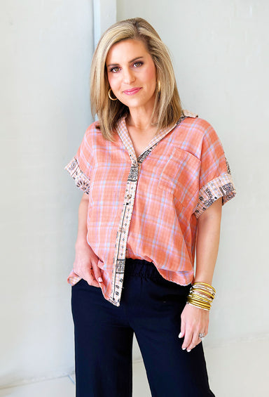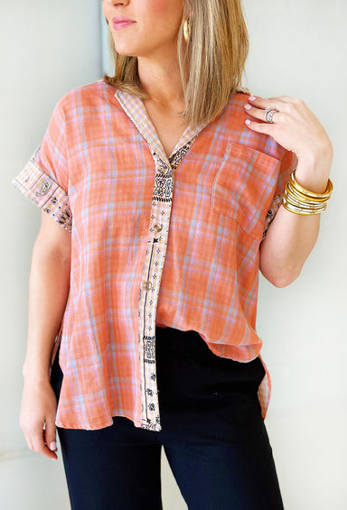 This charming quilted vest is giving all the cozy fall vibes with a pop of cheerful color. The brown base is covered in a dainty floral print in so...