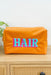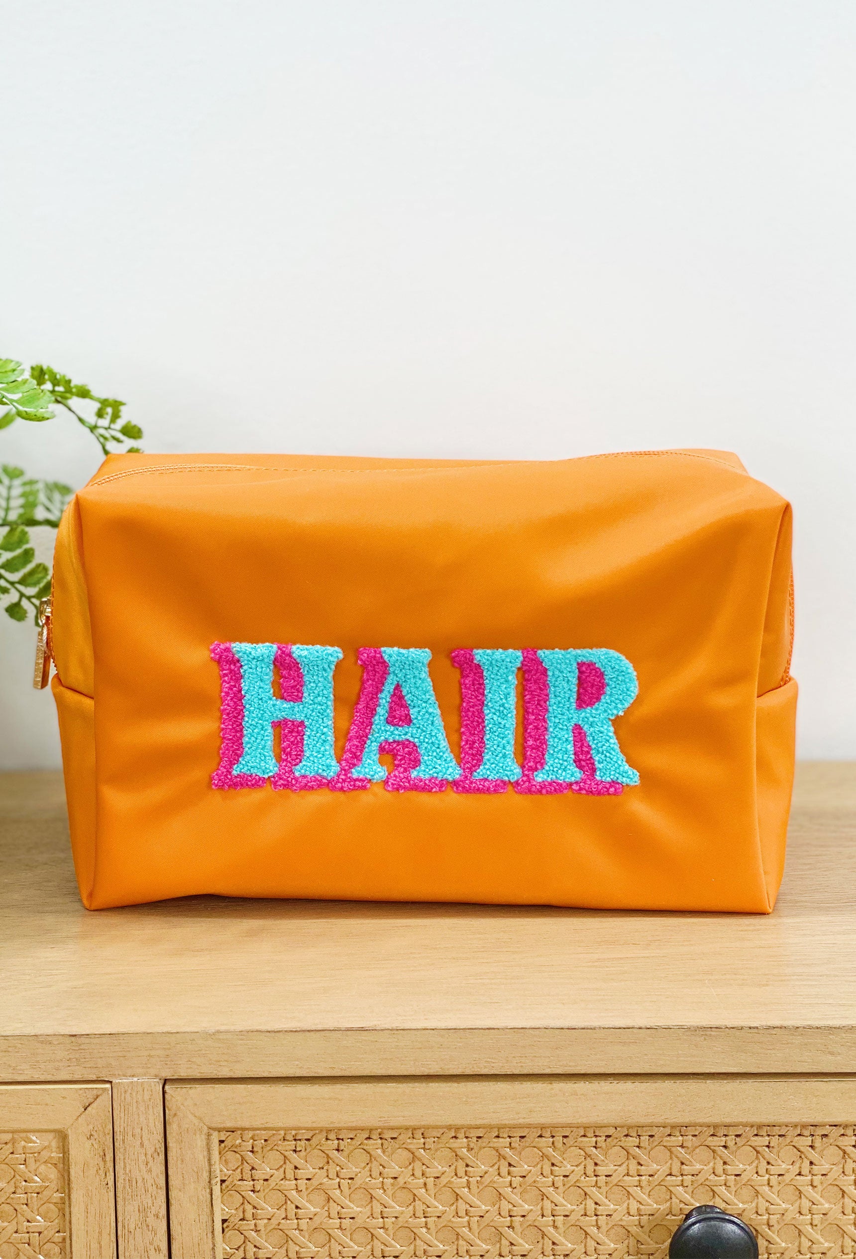 We have the perfect cosmetic bag for you! This orange nylon cosmetic bag with "hair" printed in a pink and blue textured font is perfect for all of your makeup and travel needs. It's perfect for the summer with its lightweight and durable material. Plus, it has a lot of room for all your summer essentials.
