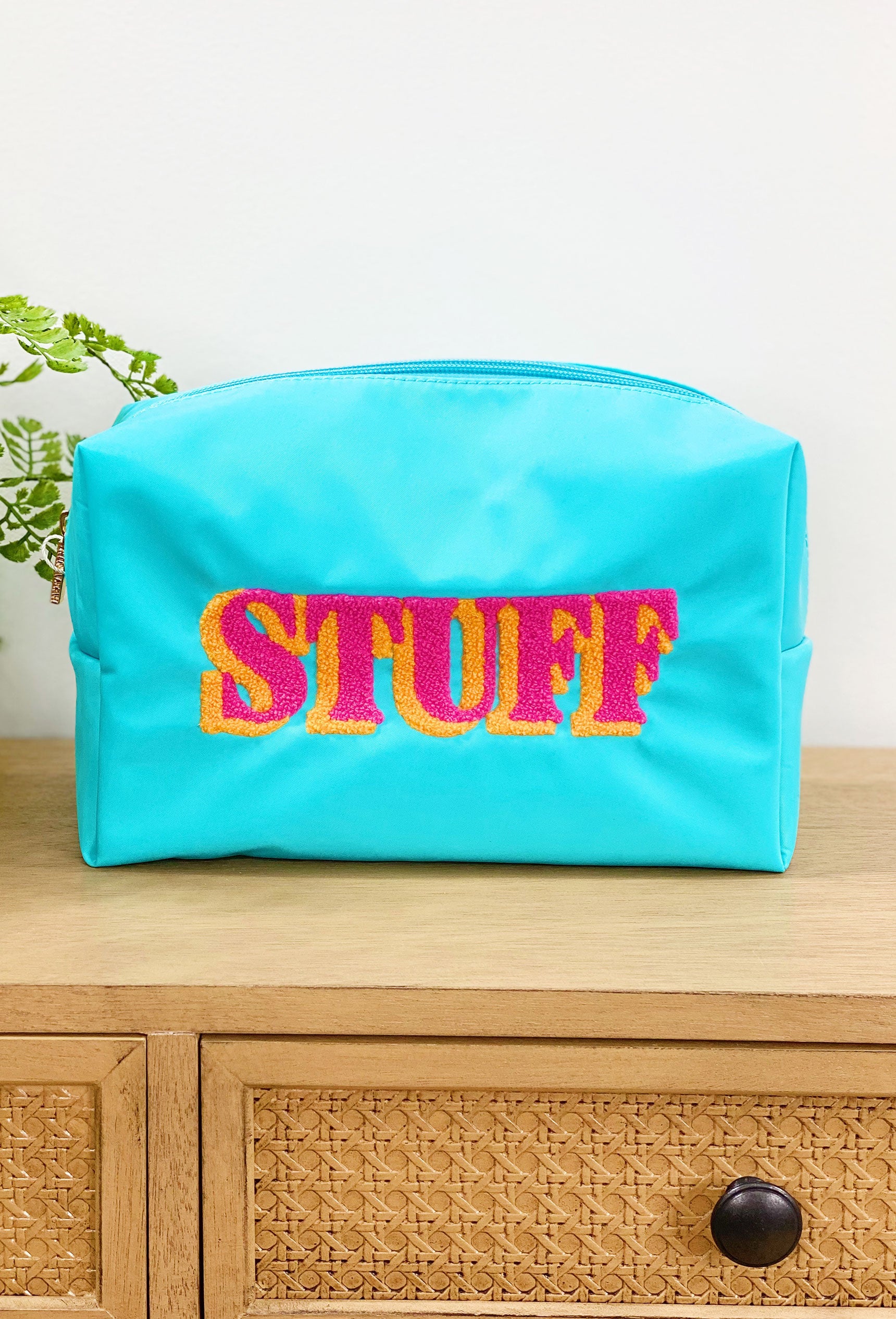 We have the perfect cosmetic bag for you! This turquoise nylon cosmetic bag with "stuff" printed in a pink and orange textured font is perfect for all of your makeup and travel needs. It's perfect for the summer with its lightweight and durable material. Plus, it has a lot of room for all your summer essentials.