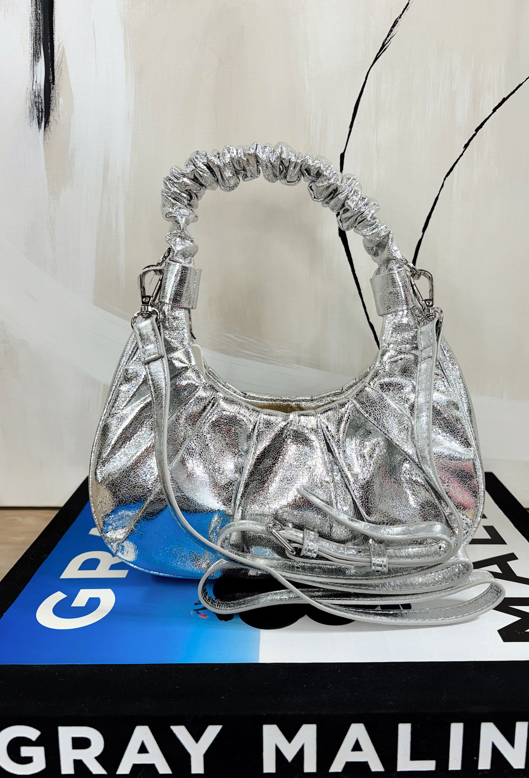 This sleek and chic bag is perfect for any occasion, whether slung over your shoulder or worn as a crossbody for hands-free convenience. The striking silver metallic finish adds a touch of glamour to your ensemble, making it a standout piece.