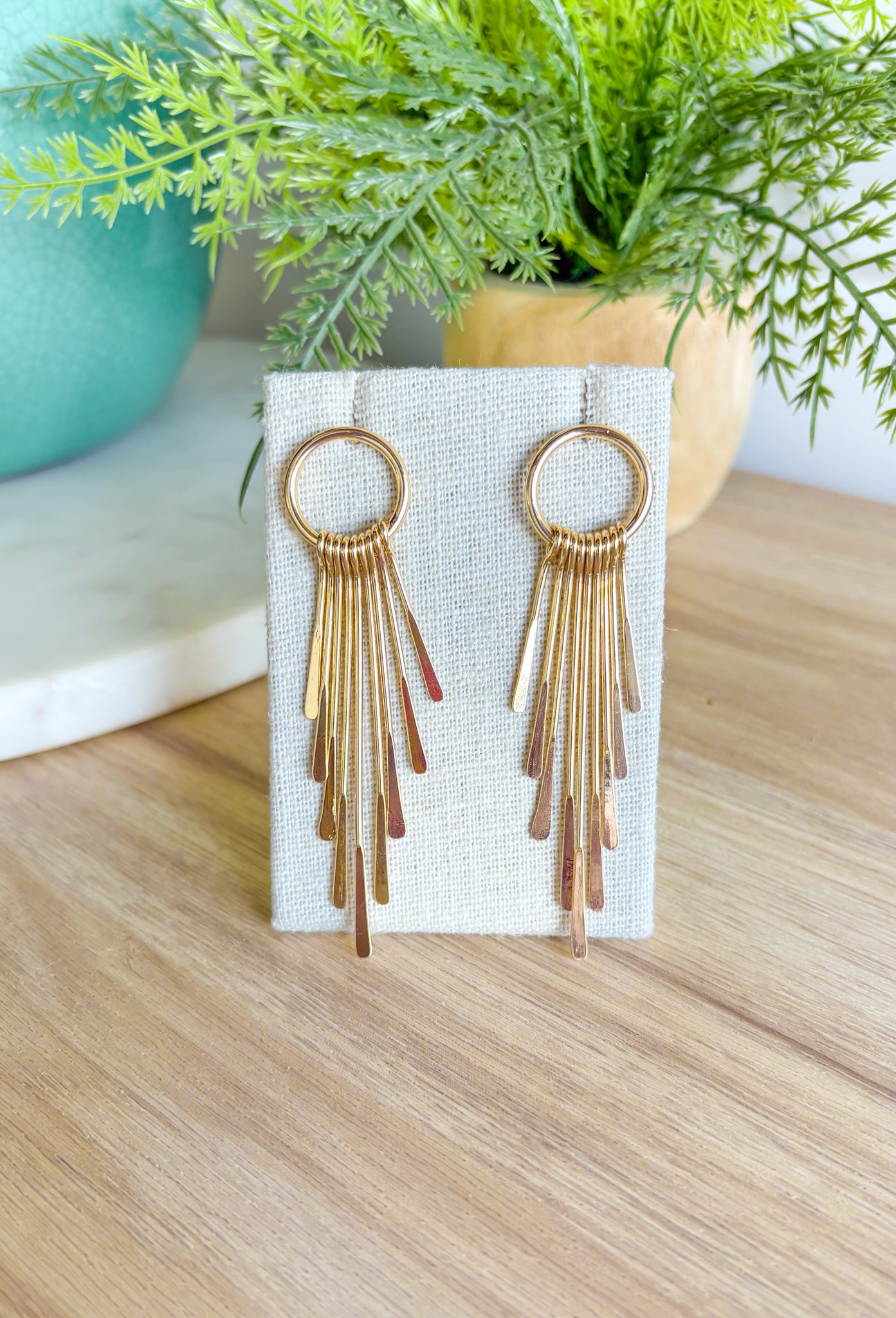 Update your look with these classic gold earrings featuring an eye-catching drop design. These earrings bring an extra touch of glamour to any outfit, making them the perfect piece to elevate any outfit.