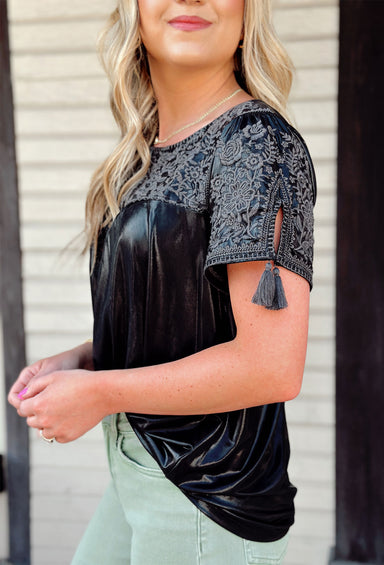 Standout sleeves make this black pullover a fall favorite. Designed with bold white embroidery, the pattern brings striking contrast and texture, w...