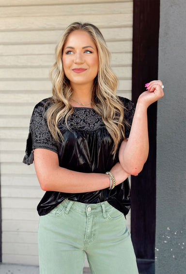Delicate florals meet cozy fall flair in this sweet puff sleeve top. The embroidered details pop against the rich green backdrop, while the contras...