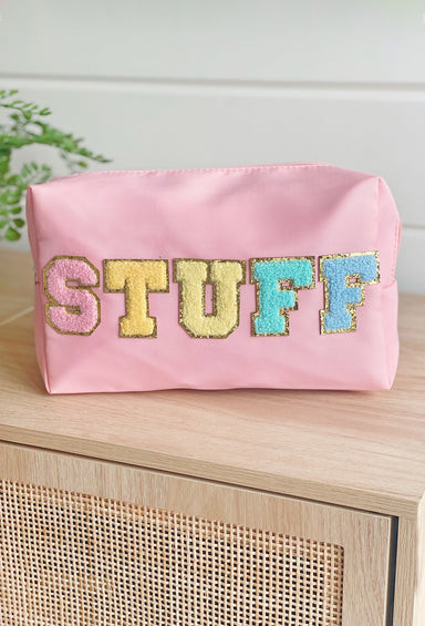 We have the perfect cosmetic bag for you! This turquoise nylon cosmetic bag with "stuff" printed in a pink and orange textured font is perfect f...